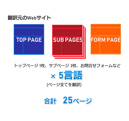 合計が5ページの構成のWebサイトで5言語分で合わせて総ページ25枚の構成となります。
