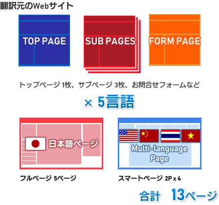 合計が5ページの構成のWebサイトで5言語分で合わせて総ページ13枚の構成となります。日本語が5ページ、ほか4言語はスマートデザインで各2ページにまとめます。